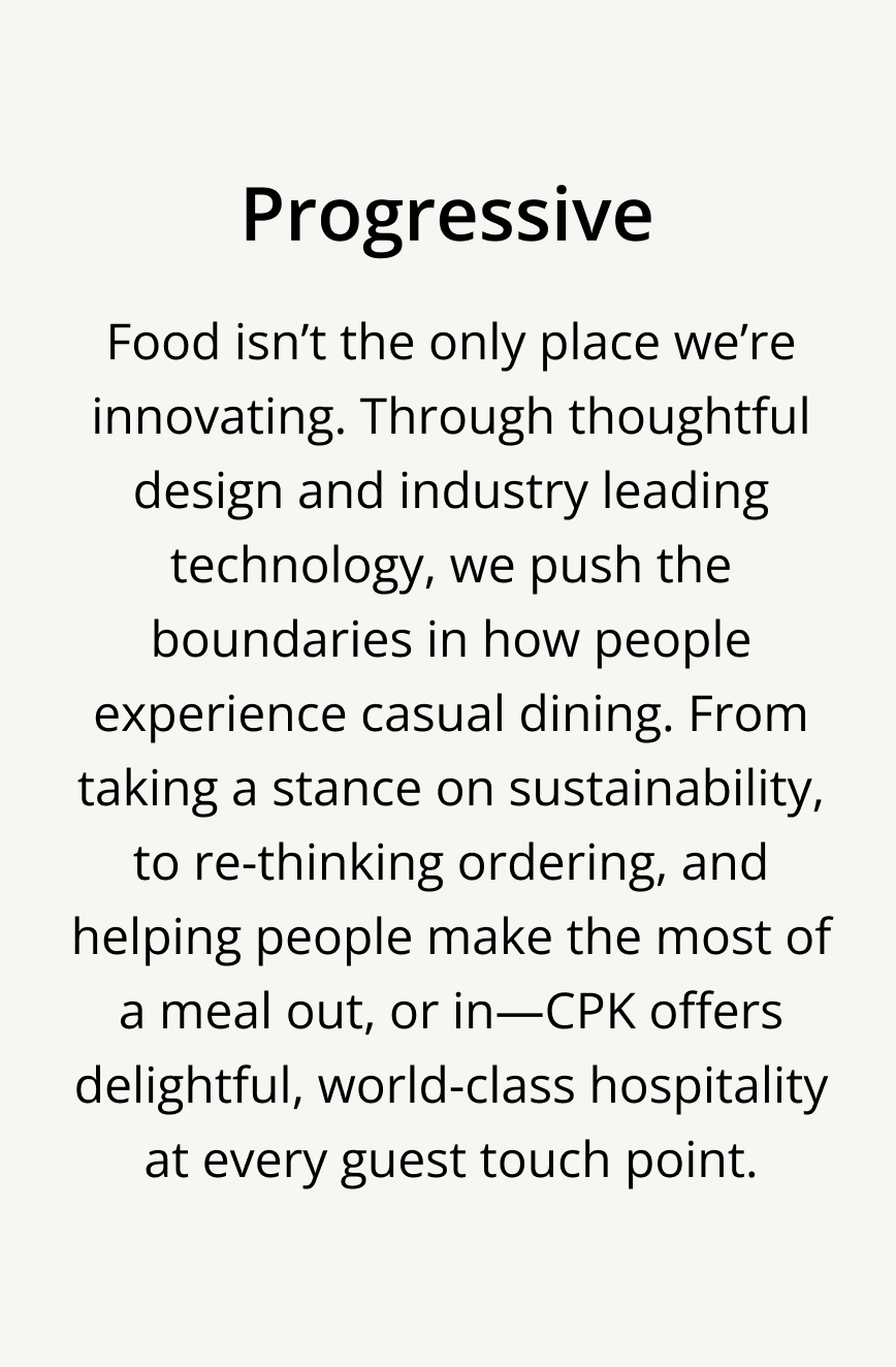 Our big insight from talking with stakeholders was that we needed to make CPK feel fresh and progressive again. California is a state of mind — and we wanted to bring that mindset to every customer who comes through CPK’s digital doorway. We started by developing experience principles that would drive our design decisions from day one.