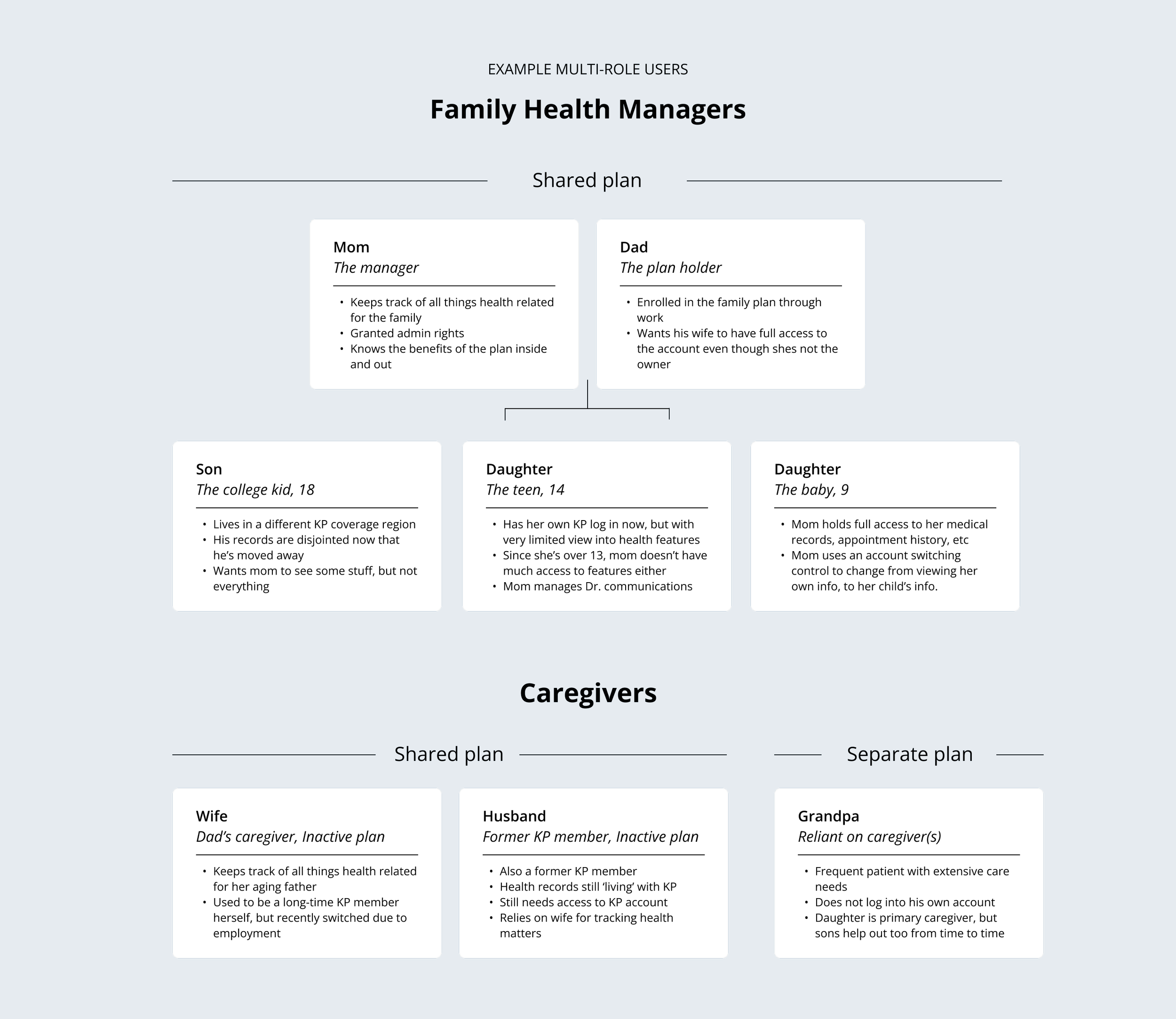 KP presented us with an important challenge among a unique segment of their customer base. The audience consisted of two groups who we came to refer to as “family health managers” and “caregivers”. In short, these are people who are responsible for overseeing the care of other people. The ask was to imagine how these multi-role users might manage their family’s care in one seamless authenticated web experience that serves and adapts to their changing needs as a KP member.